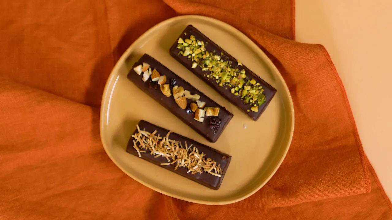 Banhe cada barrinha no chocolate derretido, coloque em uma forma coberta com papel manteiga e finalize de acordo com a sua preferência: com as castanhas, frutas secas, lascas de coco ou nibs de cacau.