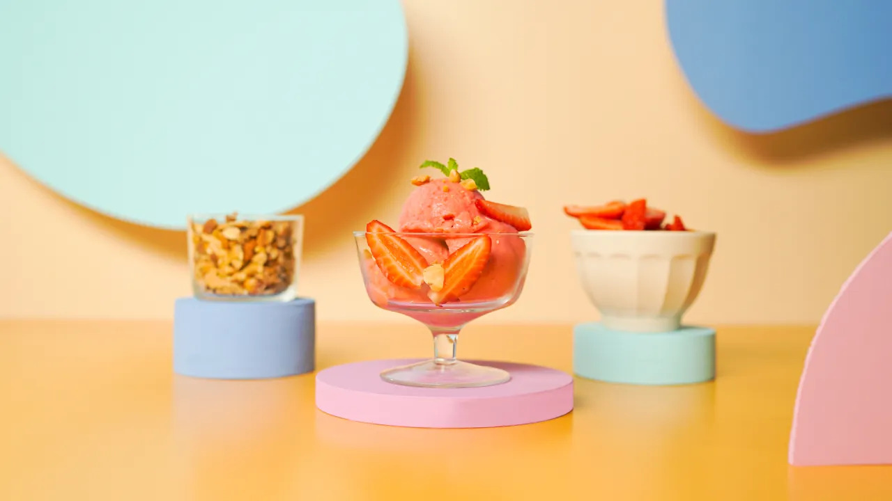 Em um liquidificador, bata os morangos congelados, o iogurte sabor morango e o mel até obter uma mistura homogênea e firme. Leve ao congelador por 2 horas. Sirva em potinhos e finalize com os morangos cortados e as castanhas por cima.