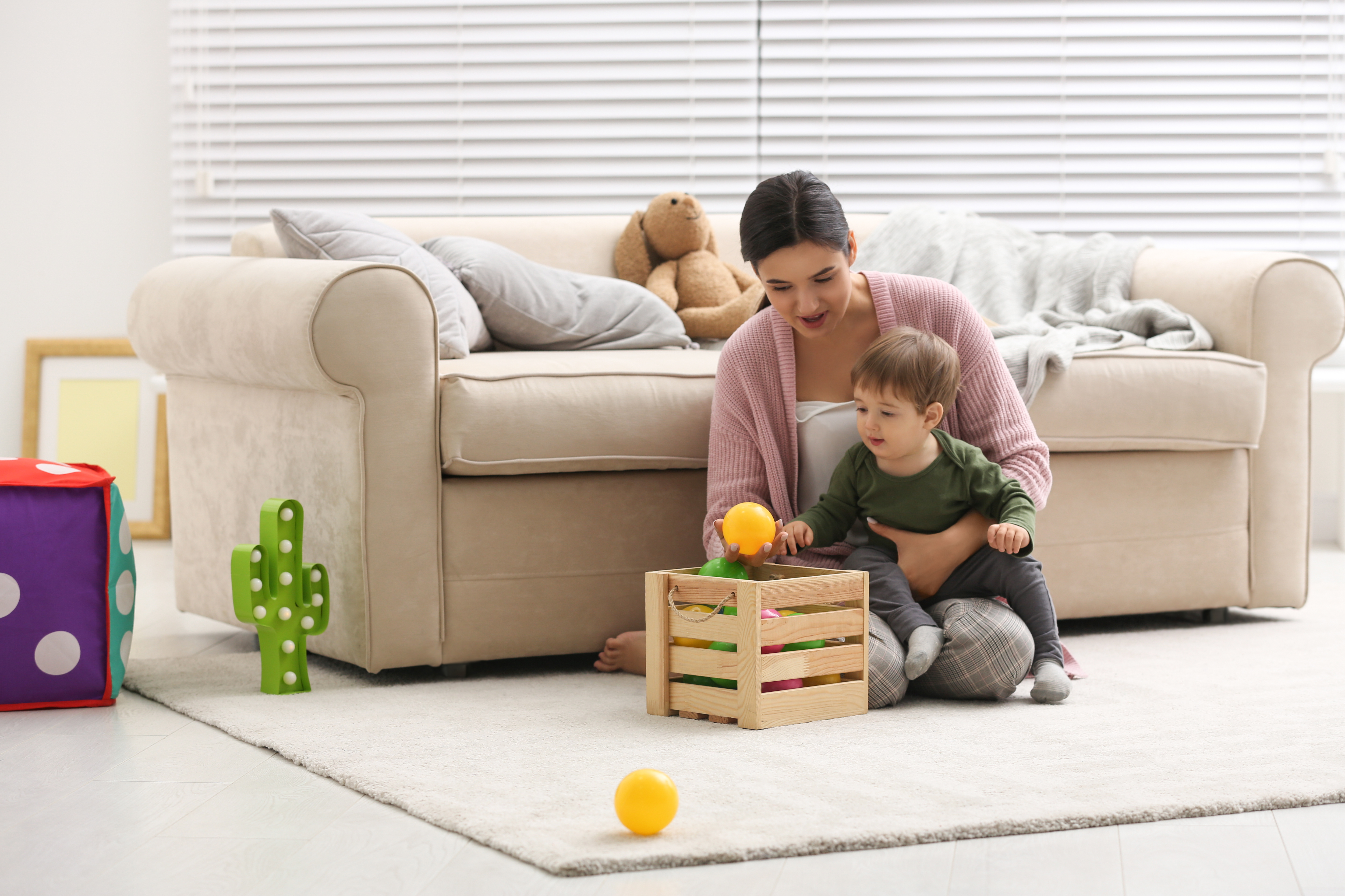 Brinquedos coloridos de empilhar, encaixar, girar, carrinhos e bolas, são indicados para essa idade, podendo aproveitar suas cores, formas e ações para ensinar às crianças novas palavras.