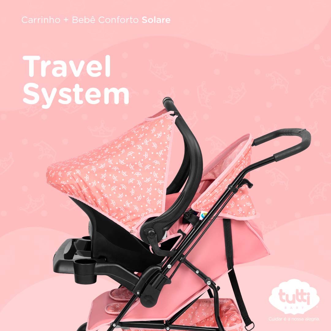- TRAVEL SYSTEM: São considerados os mais completos e versáteis do mercado. O motivo é o espaço mais amplo na parte interna e, ainda, o encaixe destinado ao bebê conforto. São modelos extremamente práticos, e que acompanham o crescimento do pequeno. O bebê conforto é uma forma prática de transportar a criança nos primeiros meses de vida. Ele é um item que pode ser apoiado no chão ou em uma mesa, podendo ser encaixado e desencaixado no carrinho de bebê.