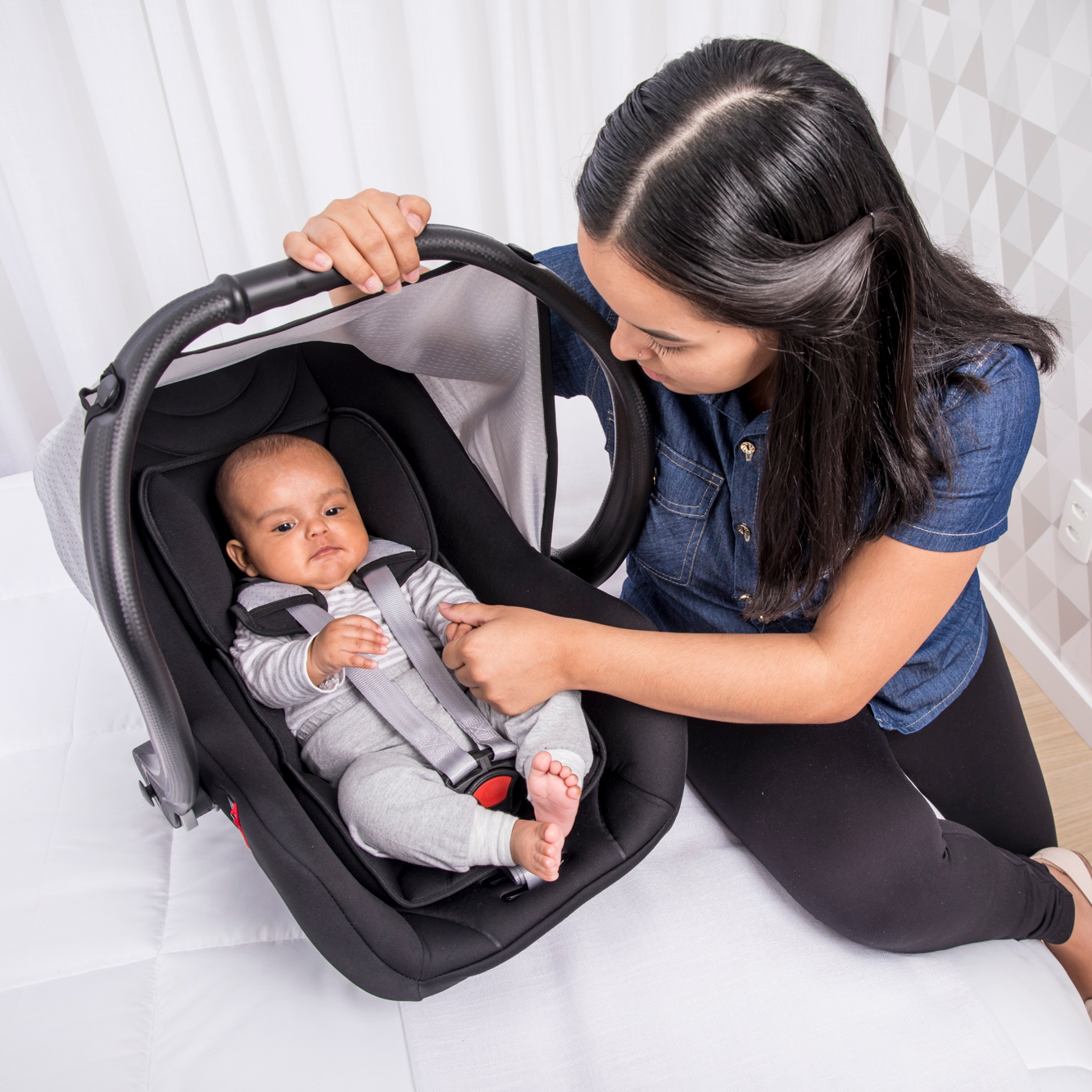 É recomendado que o bebê conforto seja instalado no banco de trás do carro e virado de costas para o banco do motorista ou do passageiro da frente.