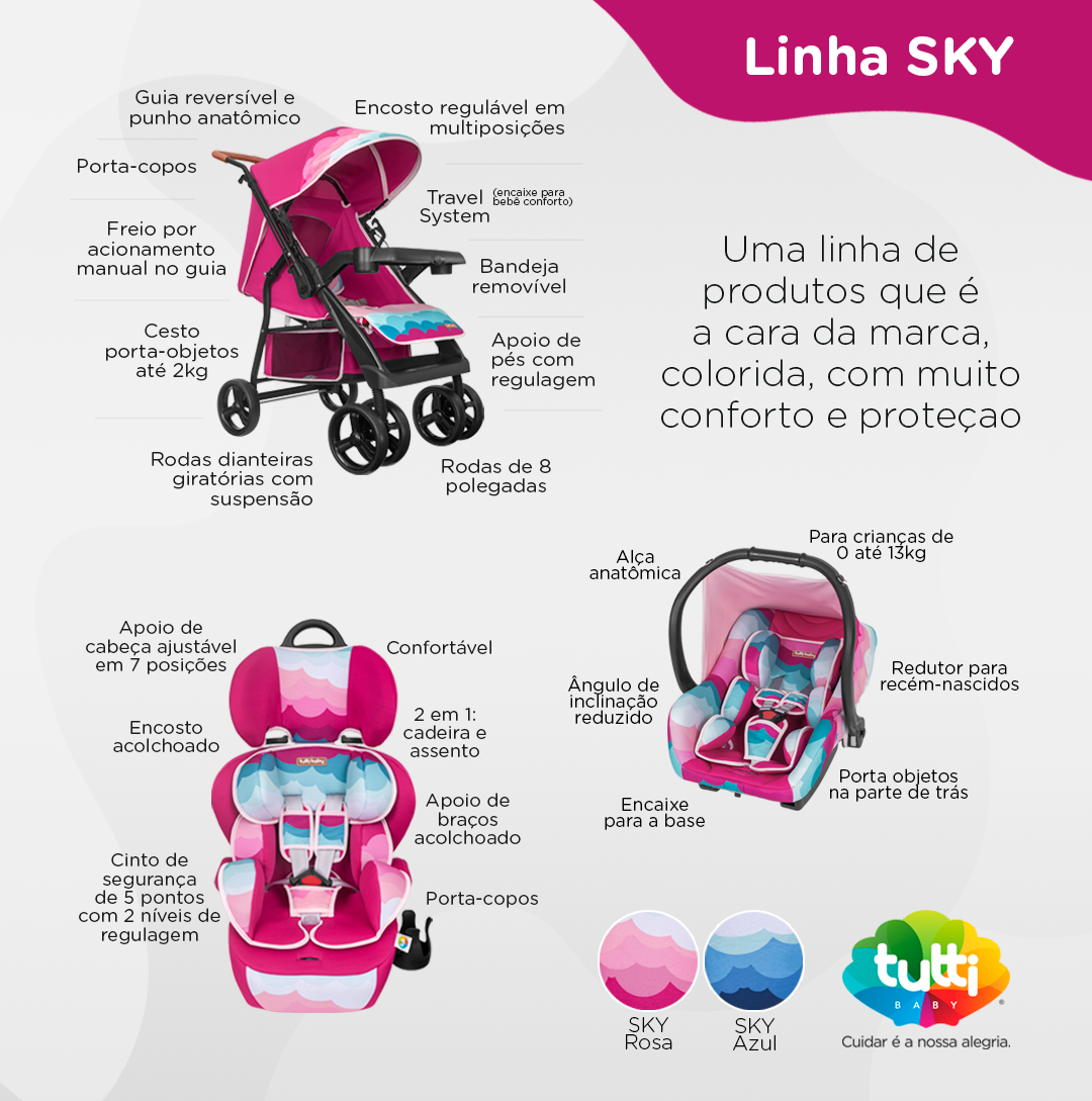 Carrinho berço com bebê conforto e poltrona para carro. A linha Sky é para papais e bebês autênticos.