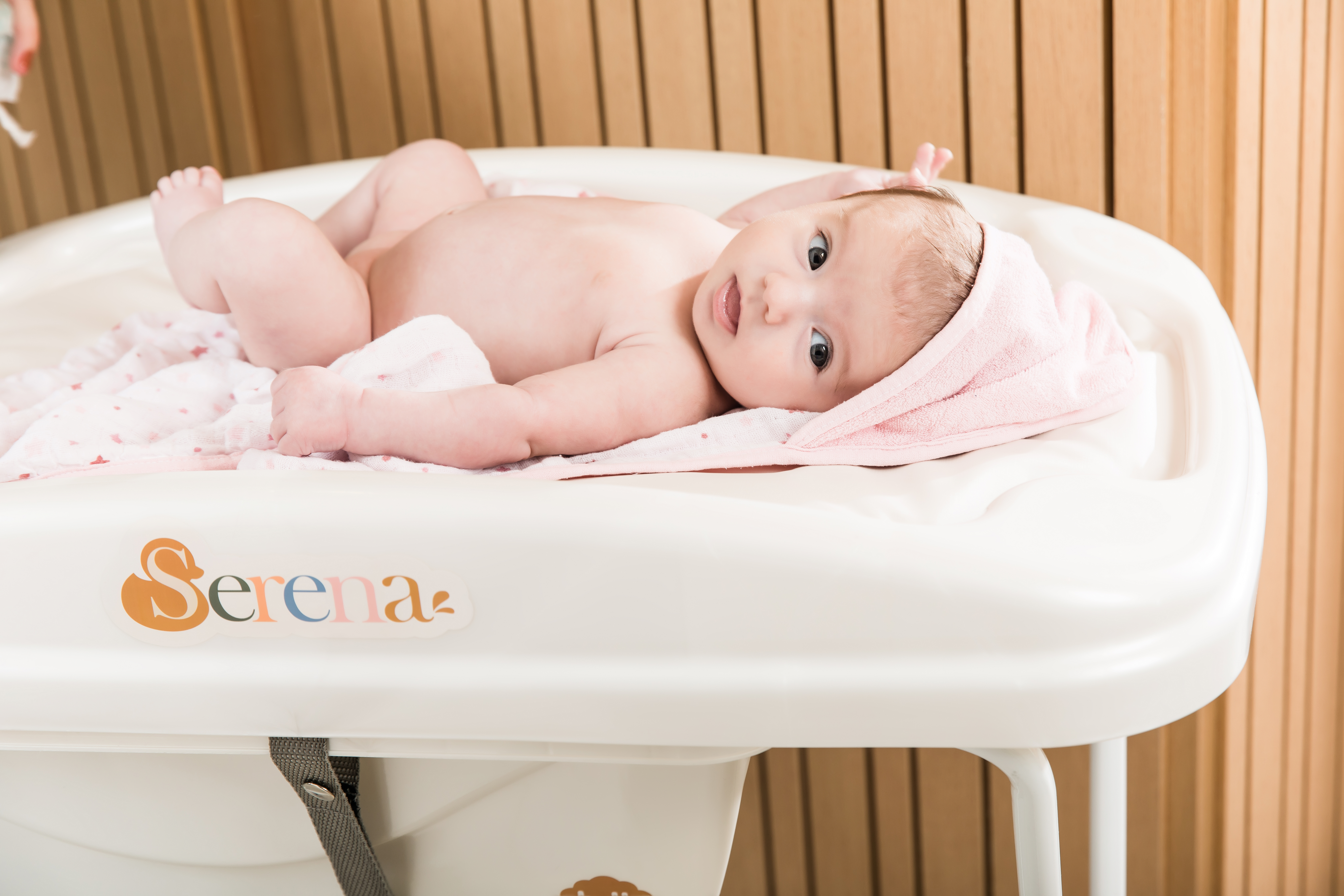 Com a banheira com trocador, tudo acontece no mesmo lugar: banho, secagem e troca!